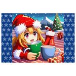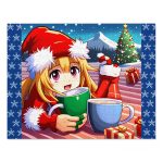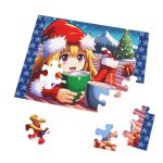 Die Aufmachung des Puzzles präsentiert ein bezauberndes Bild: Ein blondes Mädchen in einem Weihnachtsmannanzug lächelt, während es eine grüne Tasse in der Hand hält. Im Hintergrund sind voll gefüllte Weihnachtssocken und ein prächtig geschmückter Weihnachtsbaum zu sehen. Die Szene, ähnlich einem winterlichen Picknick, strahlt Freude und Wärme aus. Vor dem Mädchen steht eine hellblaue Tasse mit köstlichem Kakao.